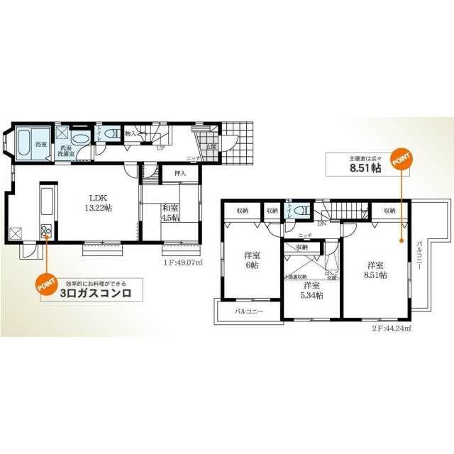 | 間取り(内訳) | 4LDK(和4.5洋8.5/6/5.3LDK13.2) | 建物面積 | 93.31㎡ |